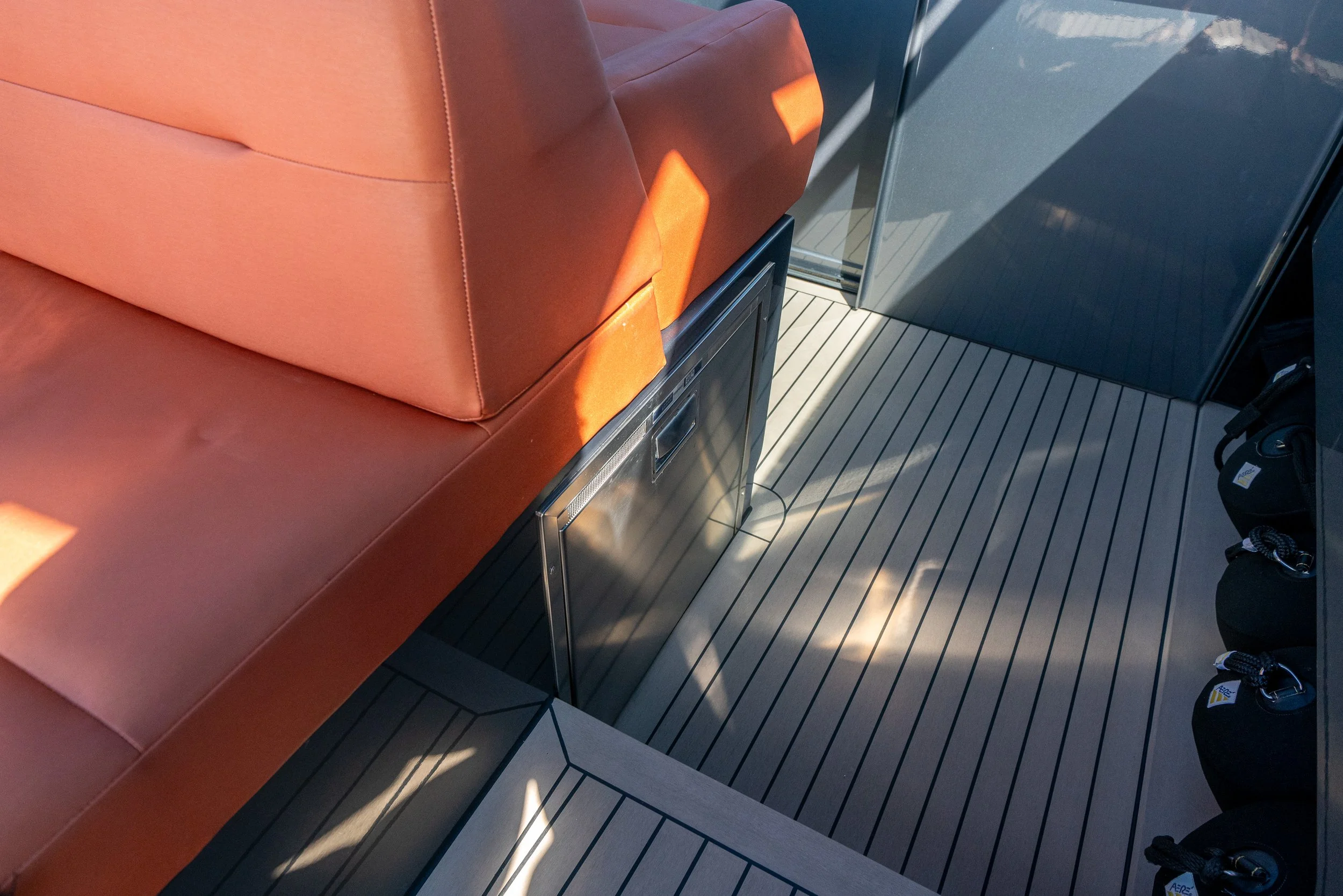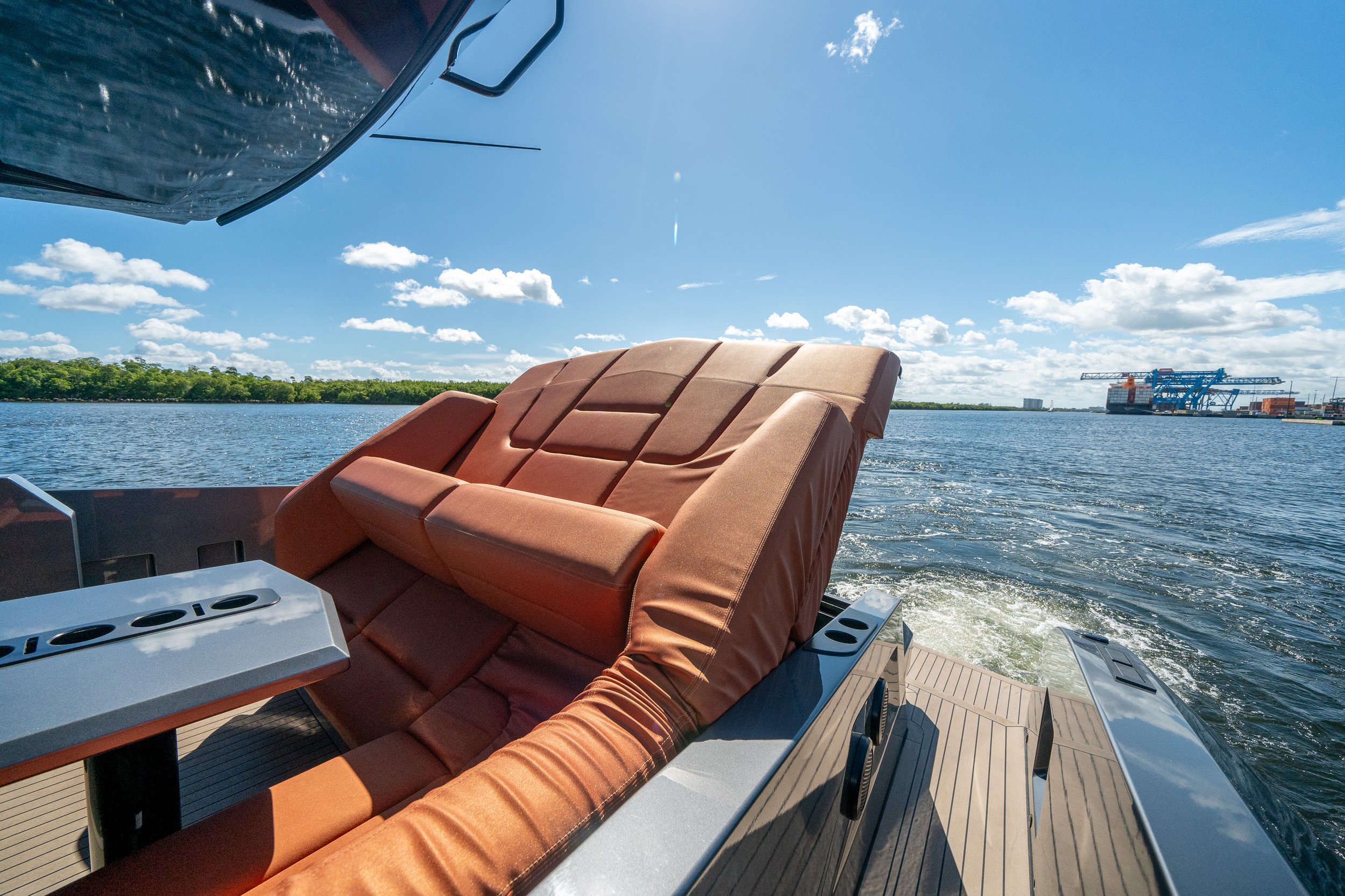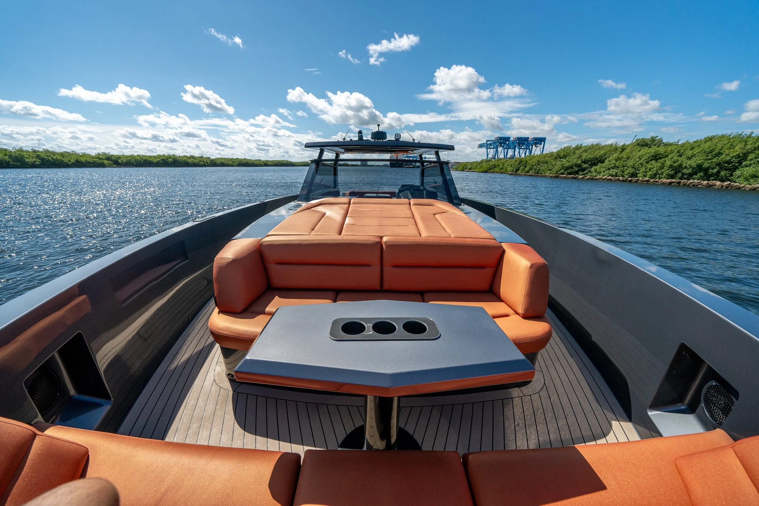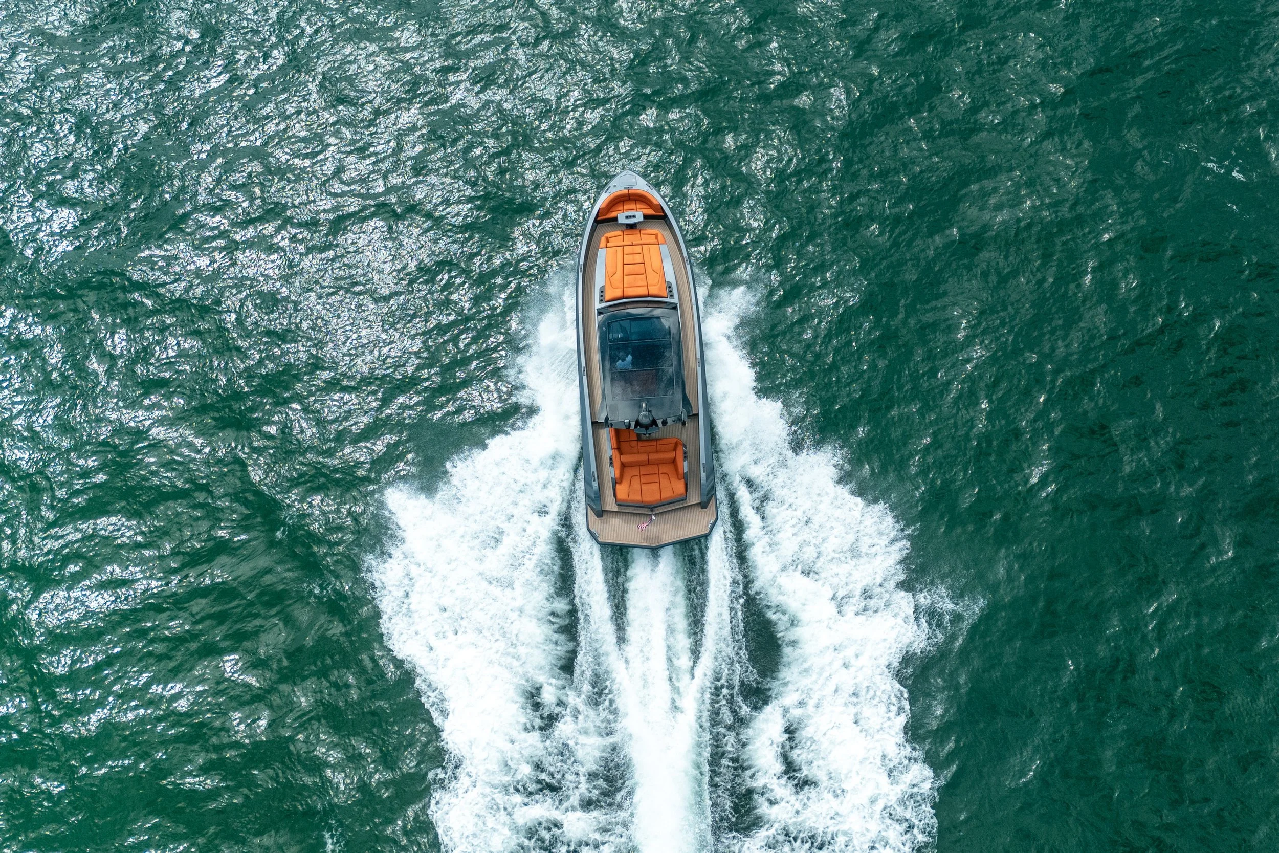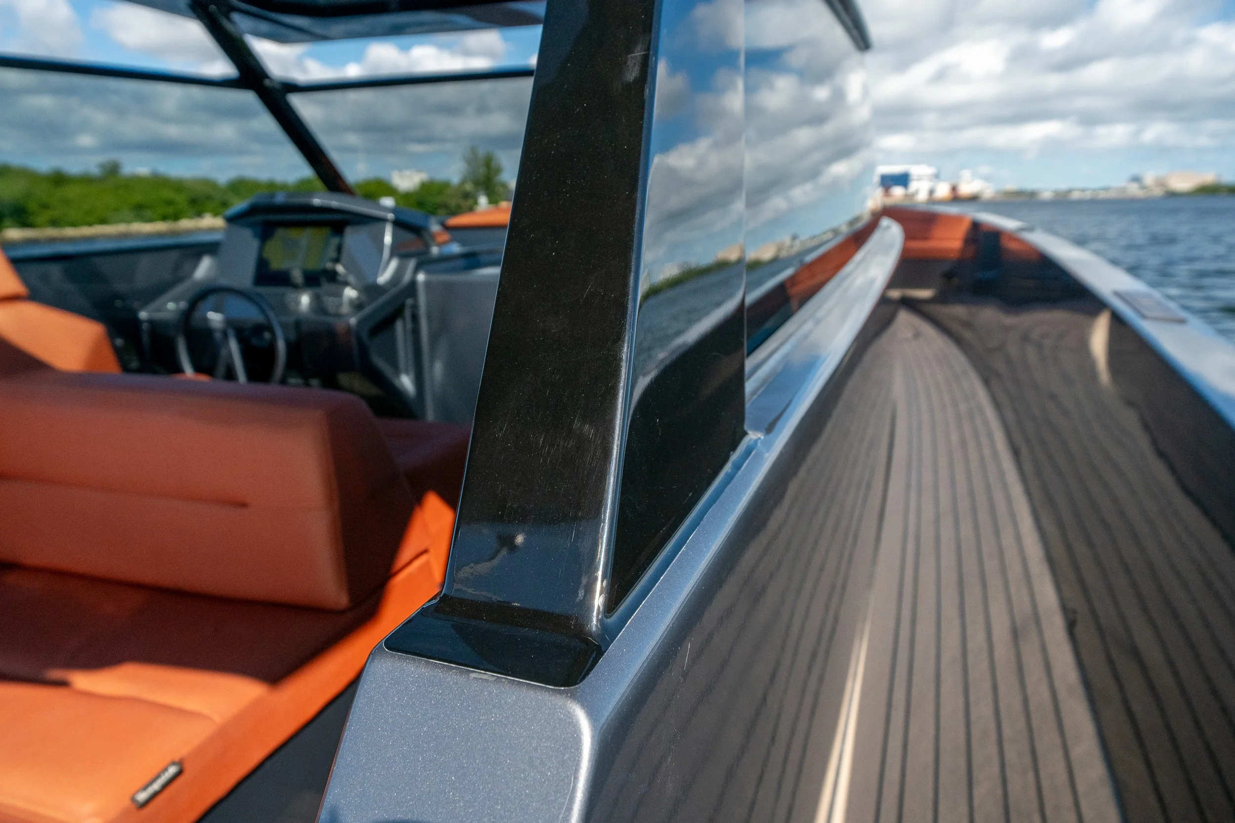 Custom grey metallic hull with vibrant orange cushions for a truly standout look