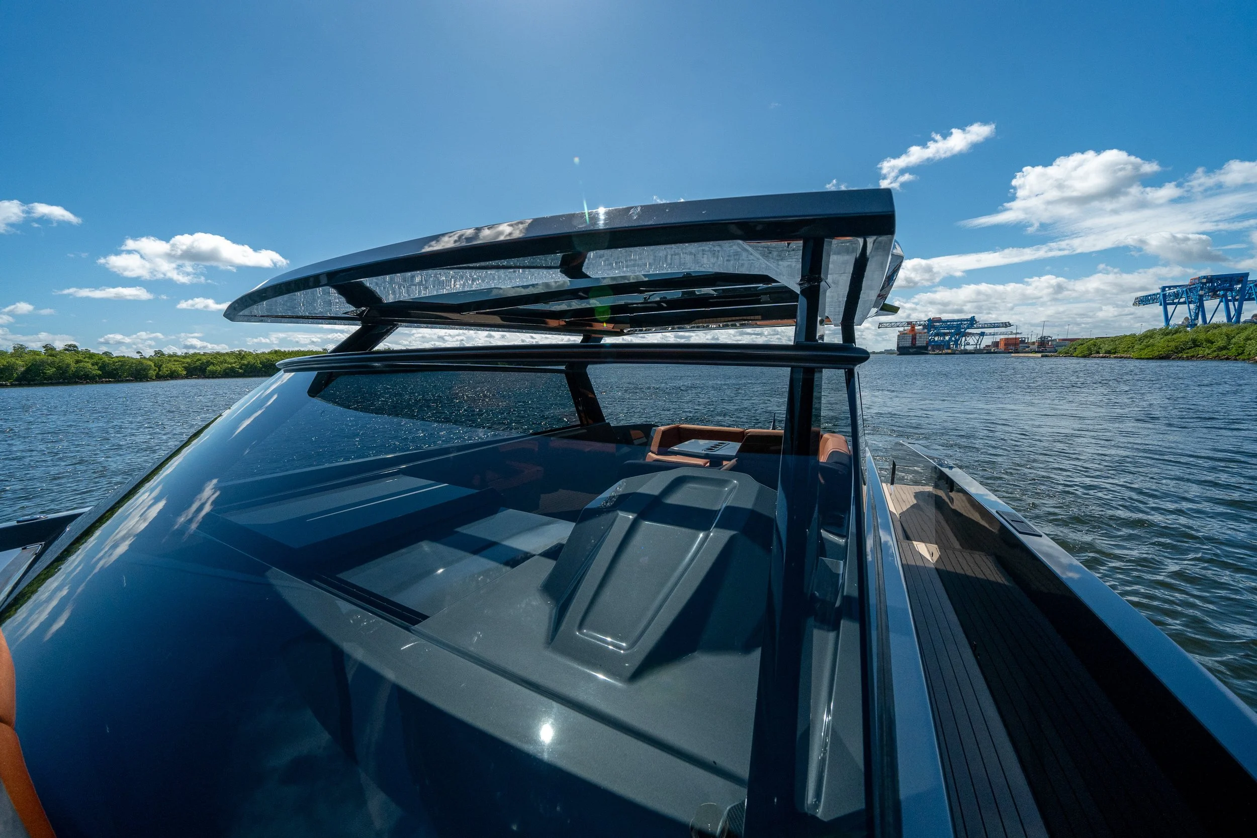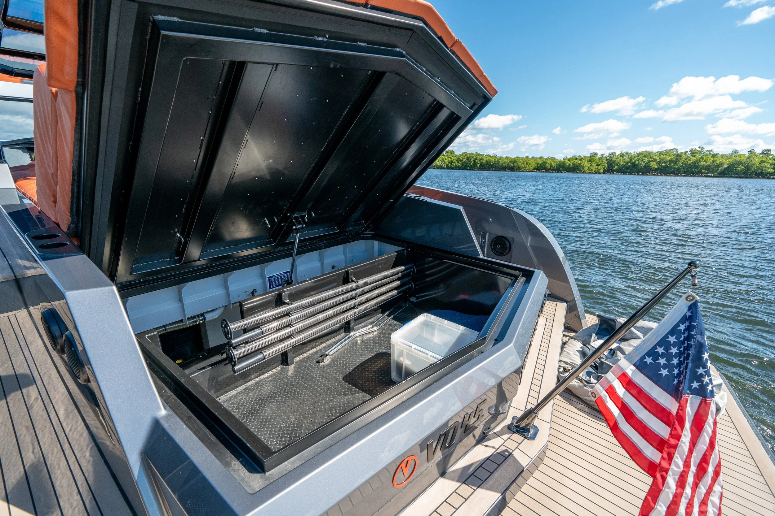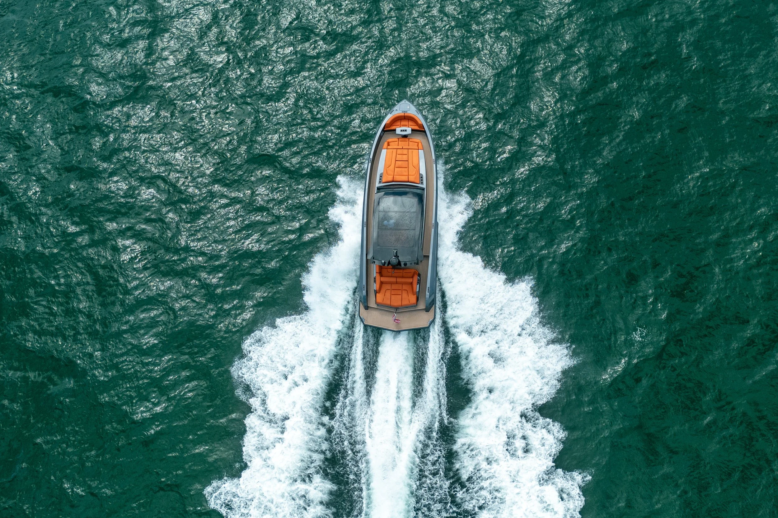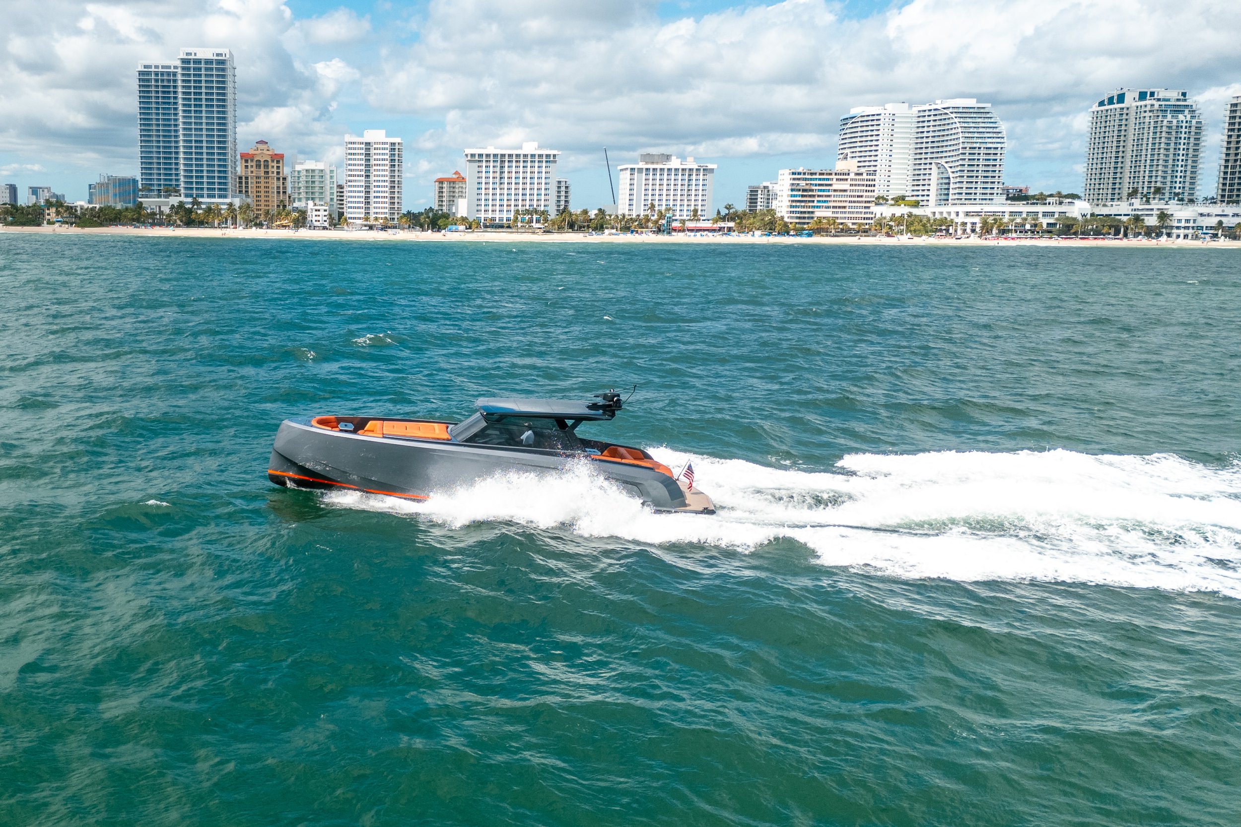 Turn heads everywhere you go with this stunning 2022 Vanquish VQ45, featuring a sleek metallic grey hull paired with vibrant orange upholstery. Blended with carbon fiber accents and the iconic embossed Vanquish emblems, this luxury day boat perfectly embodies the modern, high-performance spirit for Vanquish Yachts.